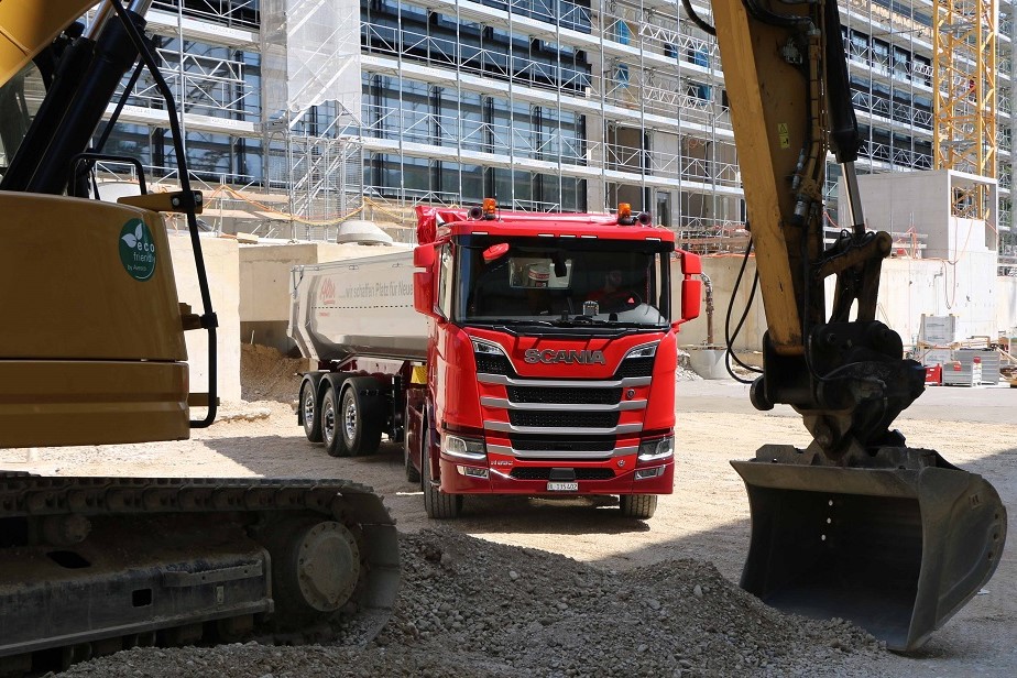 Als Produkt wählte man einen Kippauflieger der Marke Schwarzmüller, an welchem bei Bedarf die zweite Achse hydraulisch angetrieben werden kann. Doch damit war es noch nicht ganz getan. Denn am Zugfahrzeug mussten zwei unterschiedliche Hydraulikleistungen erzeugt werden, 170 Bar um die Mulde kippen zu können und 340 Bar um bei Bedarf die mittlere Auflieger-Achse antreiben zu können. Dank motorseitigem Nebenantrieb mit abgestimmter Tourenzahl konnte auch diese Herausforderung gelöst werden. So entstand eine Fahrzeugkombination, welche eine stolze Nutzlast von 26'180 kg aufweisen kann.