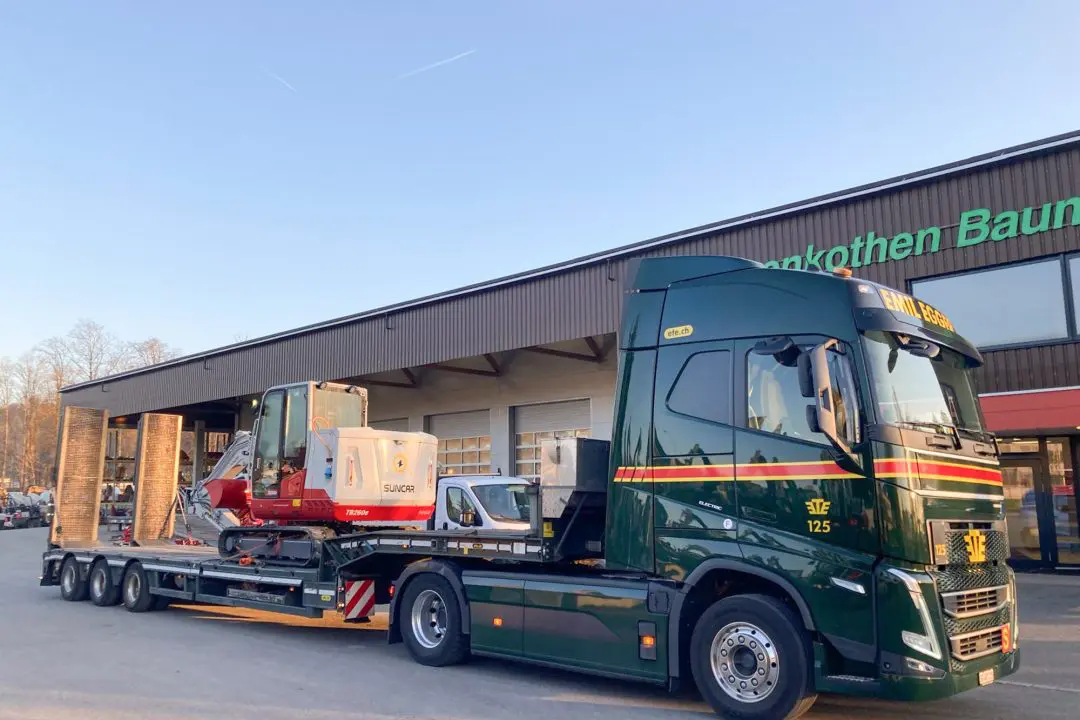 Vor Kurzem transportierte EMIL EGGER kurzfristig einen Elektrobagger von Oberbüren nach Zürich – mit einer Elektro-Zugmaschine und einem Rampenauflieger aus der Schwergut-Logistik.