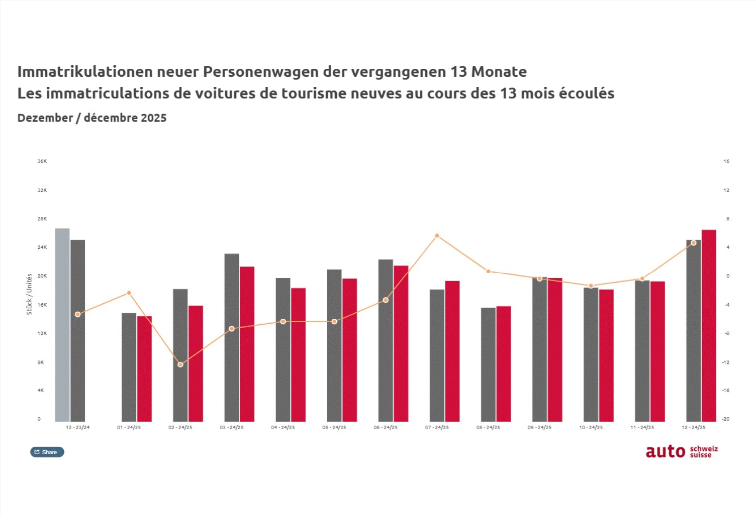 Im Dezember 2025 wurden 26’744 Autos neu zugelassen. Das sind 5,5 Prozent mehr als im Vorjahr (-0,4 Prozent). Einmal mehr hat sich der Dezember als stärkster Monat des Jahres erwiesen. Dieses Wachstum wiederholt ein saisonales Muster und darf nicht als Trendwende missverstanden werden.