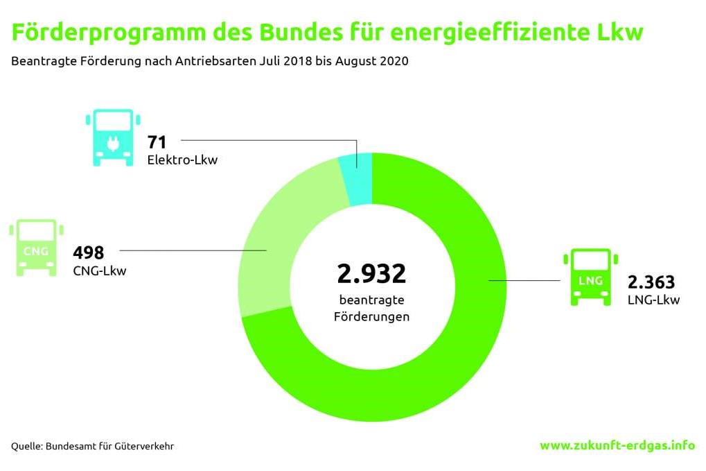 Besonders stark nachgefragt wurden dabei Lkw mit Flüssigerdgasantrieb (LNG): insgesamt 2’363 Anträge wurden hier jeweils mit 12.000 Euro unterstützt. Weitere 498 Anträge wurden für Fahrzeuge gestellt, die mit komprimiertem Erdgas (CNG) angetrieben werden; diese wurden mit jeweils 8’000 Euro gefördert. Für Elektro-Nutzfahrzeuge hingegen gingen im gleichen Zeitraum lediglich 71 Anträge ein, obwohl deren Förderung mit bis zu 40’000 Euro pro Fahrzeug am umfangreichsten ausfiel.
