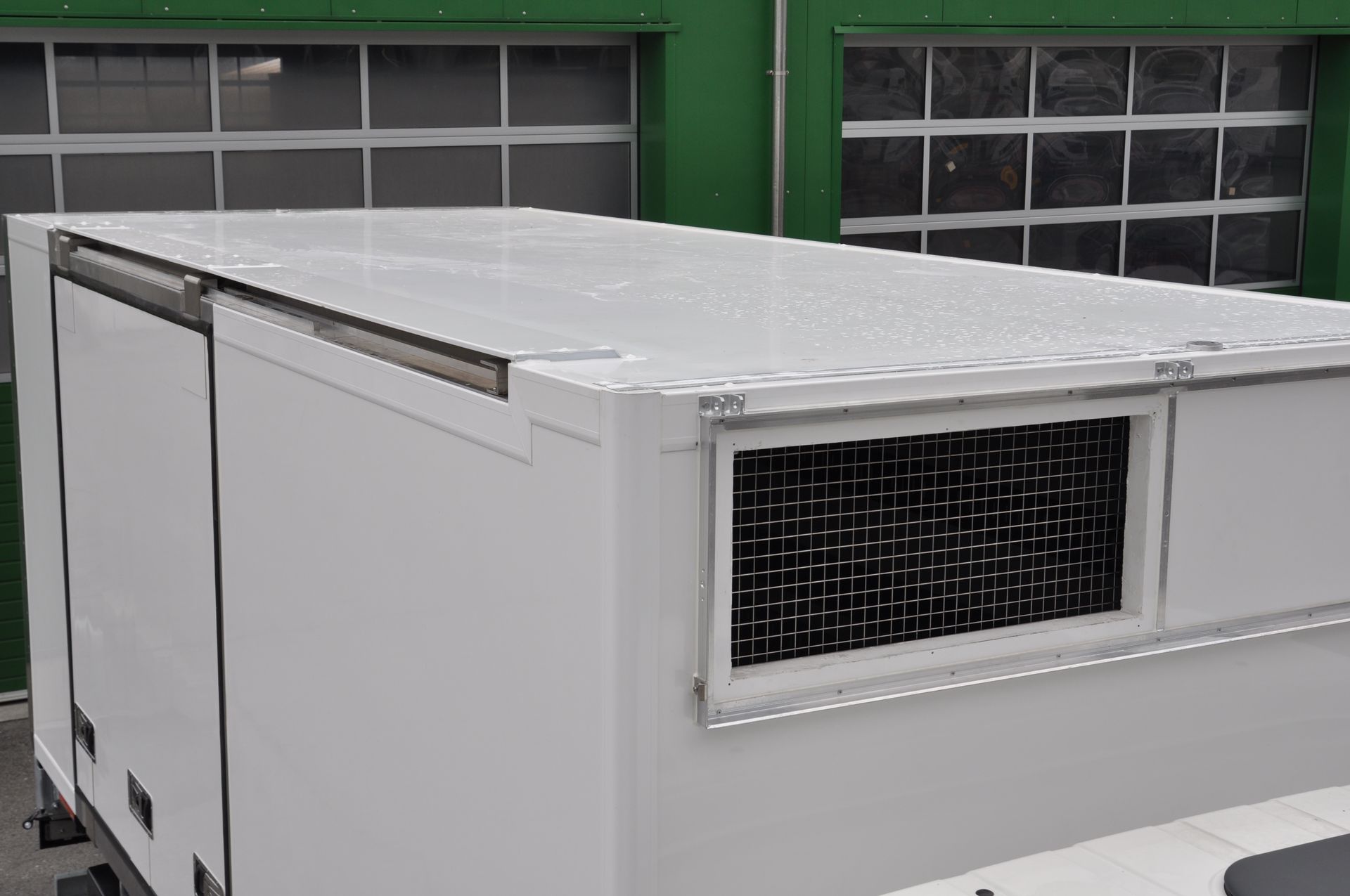 Schnee und Eis auf dem Dach kann im Strassenverkehr sehr gefährlich sein. Die Firma GK Grünenfelder AG hat für die Nutzfahrzeuge deshalb eine Dachheizung entwickelt, die direkt in die GFK Aussenhaut des Festdachaufbaus integriert wird. Die Lösung basiert auf einem in der Schweiz hergestellten Gewebe, welches direkt mit den Glasfasermatten in die GFK Aussenhaut des Daches einlaminiert ist und mit der Sandwich-Aussenhaut eine Einheit bildet. Alternativ kann das System als Laminatbahn auf Dächern montiert werden, die nicht aus Kunststoff sind. Das Gewebe ist ganzflächig elektrisch leitend. Die Stromversorgung erfolgt extern über das vorhandene Stromnetz. Durch den durchfliessenden Strom wird das Gewebe erwärmt. Schnee und Eis bleiben so nicht am Dach haften.