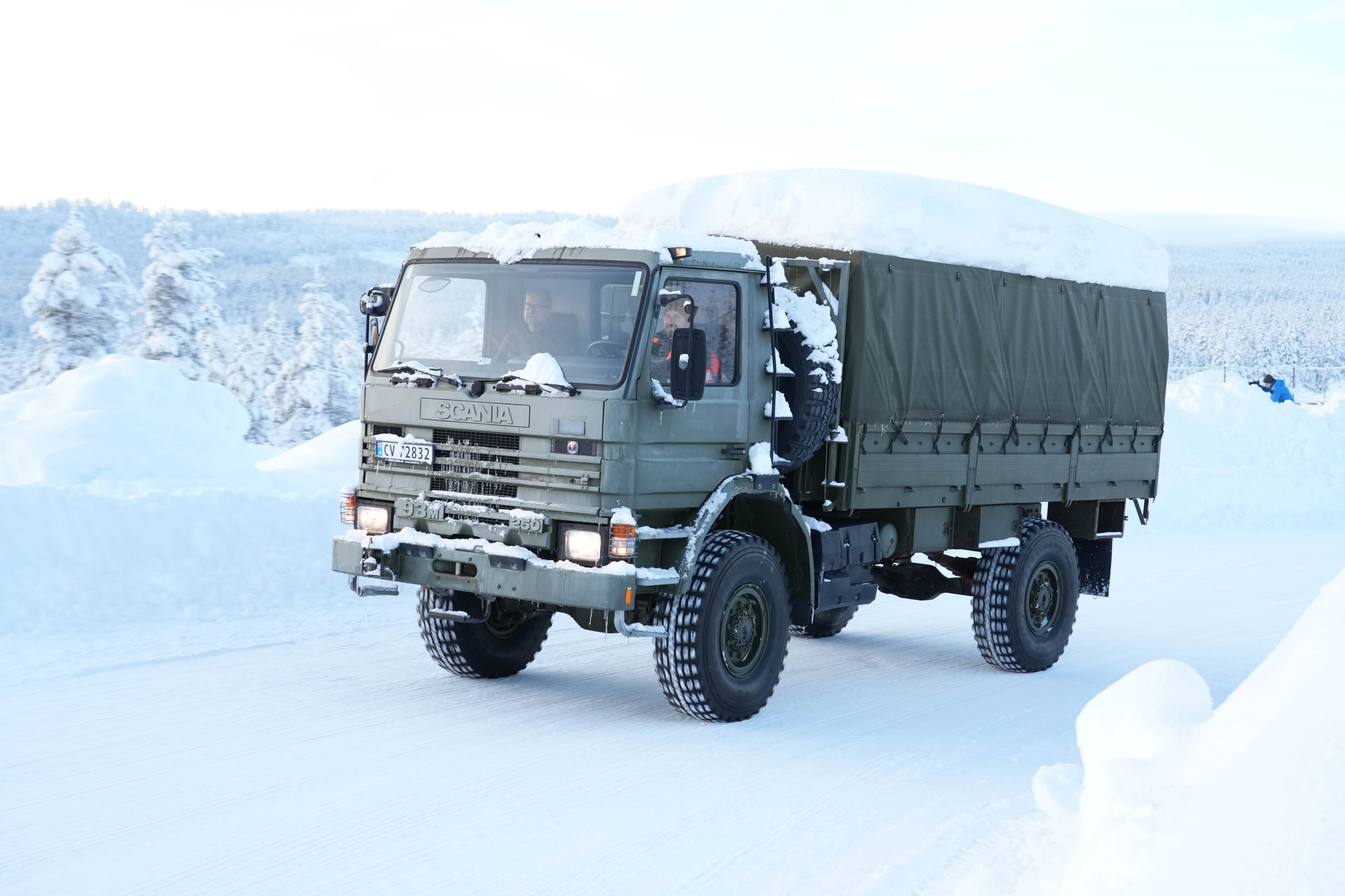 Vom alten Scania 93 M 250 über den Scania SUPER und dem Scania V8 bis hin zum Battery Electric Vehicle (BEV), vom zweiachsigen Solofahrzeug über dreiachsige Zugmaschinen bis hin zum siebenachsigen Anhängerzug standen 25 Lastwagen in Reih’ und Glied auf dem grossen Platz inmitten der tiefverschneiten norwegischen Wälder bereit. Während der alte Militärlastwagen Scania 93 M mit Stachelketten durch fast unwegsames Gelände bewegt werden durfte, konnte auf der Landebahn der Schneepflug erprobt werden. Auf zwei weiteren kurvigen Strecken auf dem Flugplatzgelände wurde die Wendigkeit der verschiedenen Fahrzeugkombinationen erfahren. Wer über einen gültigen Führerschein verfügte, durfte die Lastwagen auf den öffentlichen Strassen testen. Die Strasse Richtung Trysil beinhaltete ein rund 6 km langes Gefälle, führte über eine Brücke und über einen Kreisverkehr und die Steigung zurück zum Flugplatzgelände. Der Schneefall am Vortag und Temperaturen von wenigen Minusgraden führten dazu, dass die Strasse sehr eisig und somit rutschig war. Sogar die Norweger selbst meinten, dass es eisiger sei als üblich. Vor allem mit den bis zu 60 Tonnen schweren Sattel- und Anhängerzügen musste beim Abwärtsfahren sehr sorgfältig mit Fussbremse und Retarder umgegangen werden. Die lupenreinen Schaltvorgänge des neuen GA25/35 Getriebe und der fein dosierbare Retarder trugen dabei viel zur sicheren Fahrt bei. Gleichzeitig mit der Strasse stieg wohl beim einen oder anderen Medienschaffenden auch der Blutdruck etwas an, wenn er fühlte, dass das Fahrzeug an Traktion verlor und sich die Antischlupfregelung einschaltete. Der jeweilige norwegische Beifahrer blieb jedoch die Ruhe selbst und betätigte lediglich die Achsentlastung und Differenzialsperre.