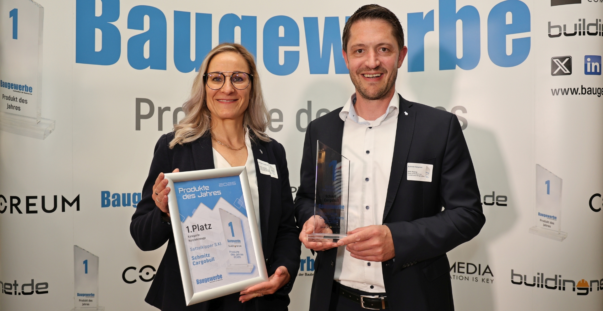 Die Gewinner der diesjährigen Leserwahl zum „Produkt des Jahres“ des Deutschen Baufachmagazins Baugewerbe stehen fest. Erneut nahm Schmitz Cargobull, vertreten durch Dirk Resing, Head of Product Line Construction & Agriculture und Kristin Hobert, Product Managerin Product Line Construction & Agriculture, den begehrten Preis in der Kategorie „Nutzfahrzeuge“ bei der offiziellen Preisverleihung am 20. Mai in München entgegen.