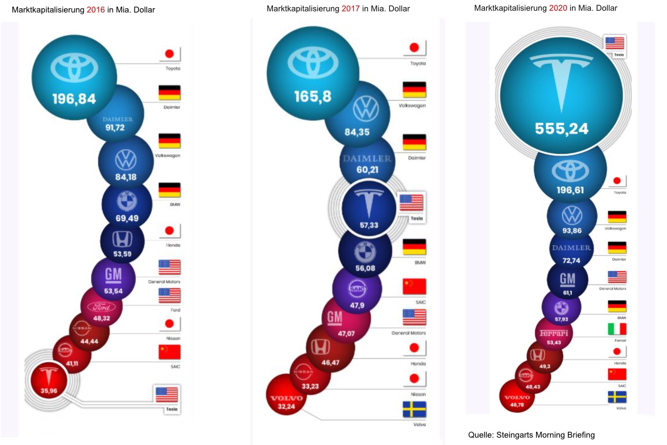 Im Fünfjahresvergleich hat das Wertpapier des Bauers von E-Autos gar um über 1100 Prozent zugelegt. Das freut nicht nur den risikofreudigen Anleger, das hat auch Auswirkungen auf den Marktwert des Unternehmens. 2016 tauchte Tesla, nach Marktkapitalisierung, erstmals in den Top Ten der – nach Börsenkapitalisierung – wertvollsten Autobauer auf. Ein Jahr später hatte sich Elon Musks Automarke an GM und BMW vorbei schon auf Rang 4 vorgearbeitet, wie «Steingarts Morning Briefing» in einer Grafik aufarbeitete. Nun, mit der Kursexplosion im 2020, ist Tesla der mit Abstand am höchsten bewertete Autohersteller der Welt. Und mehr wert als Toyota, Volkswagen, Daimler und GM zusammen.