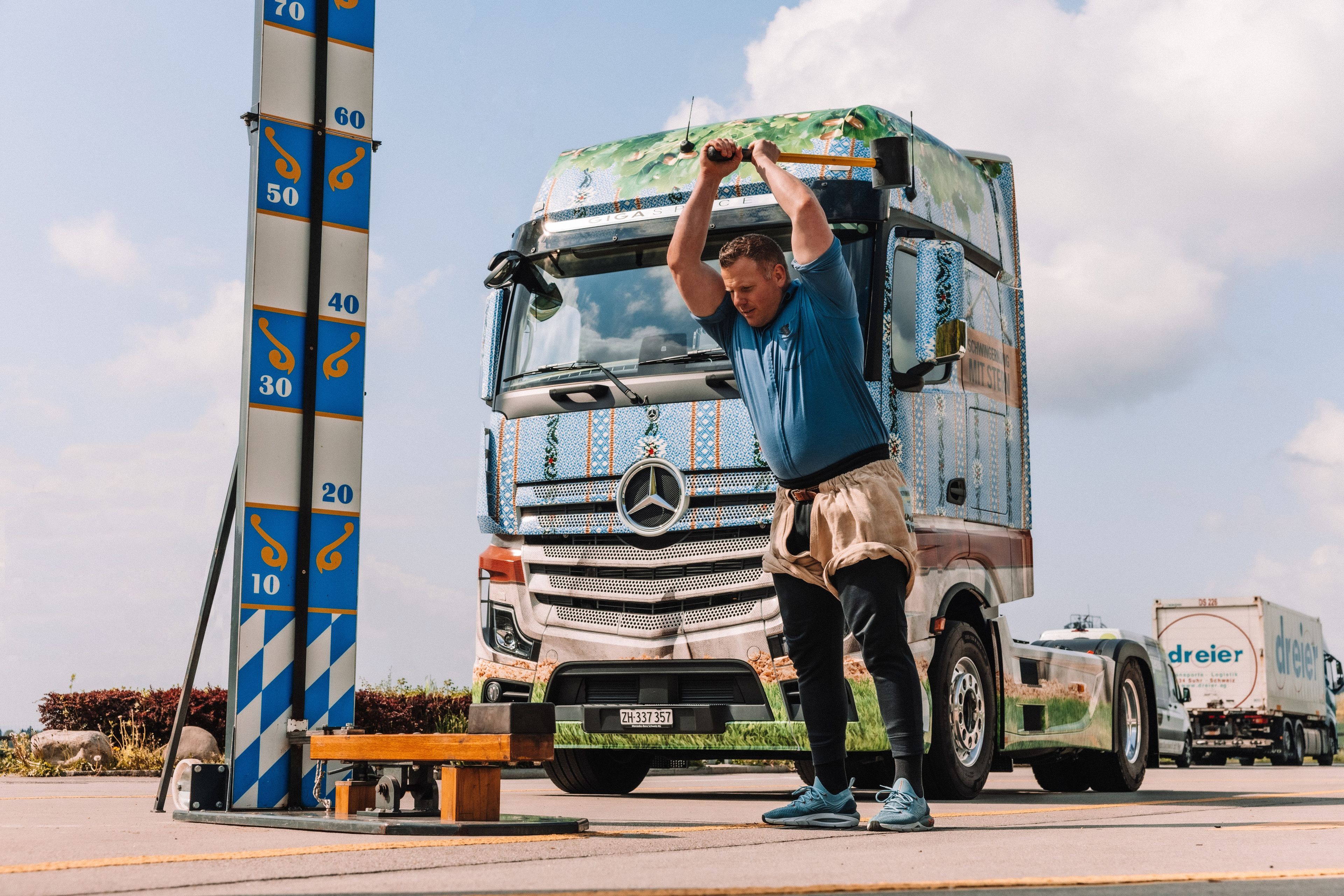 «In diesem Jahr haben wir uns etwas Besonderes ausgedacht» sagt Svenja Lyhs. Die Trucker staunen nicht schlecht, als sie an der Raststätte Gunzgen Nord an einem Wochentag im Mai auf einmal auf Schwingerkönig 2016 Matthias Glarner treffen. Er erwartet sie mit einer besonderen Challenge. Beim «Hau den Lukas» können die Lkw-Fahrer ihre Kraft unter Beweis stellen und Give-Aways von Mercedes-Benz Trucks gewinnen. Der neue Actros L, komplett als Schwinger eingekleidet, sorgt zudem für Aufmerksamkeit und zieht viele Interessierte an.