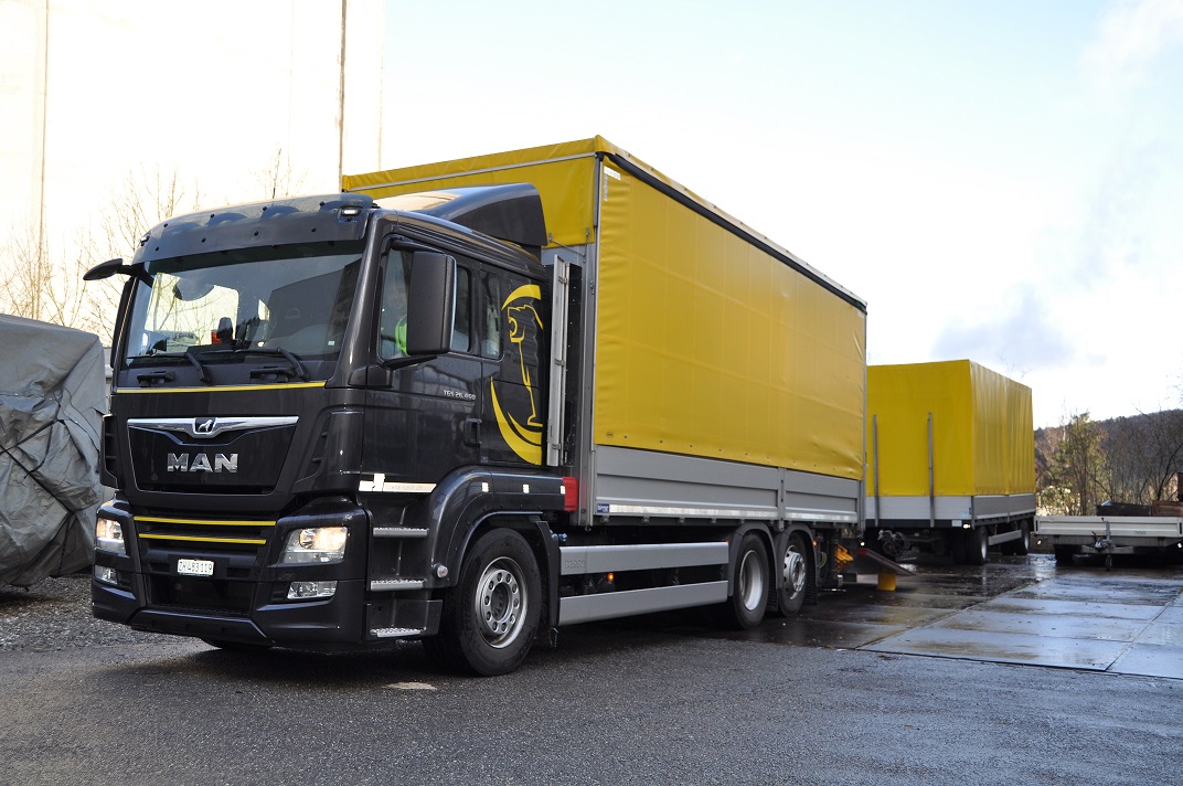 Die Trans Tech R. Suter bringt hierfür nicht nur jahrzehntelange Erfahrung mit, sondern auch die passenden Geräte und Einrichtungen. Dazu zählen kompakte Schwerlaststapler von Clark oder Kalmar mit Leergewichten bis 10 Tonnen. Transportiert werden diese seit Herbst 2019 mit dem neuen MAN TGS 26.460 6x2-4 LL mit L-Fahrerhaus und TipMatic. Der Aufbau von Birrer mit gelber Blache kommt auf den ersten Blick unscheinbar daher, beinhaltet aber einige technische „Leckerbissen“: Im Heck eine 10-t-Hebebühne von Dhollandia, in die Stirnwand eingelassen eine Seilwinde, auf der Ladefläche und an den Wänden massive Befestigungsschienen und auf dem Dach ein AirPipe-System zur Vermeidung von Regenwasseransammlungen. Während der Blachenaufbau hydraulisch höhenverstellbar ist, werden Hebebühne und Seilwinde elektrisch angetrieben, was insbesondere beim Be- und Entladen der Schwerlaststapler ordentlich Elektro-Power erfordert. Für den TGS, der ab Werk mit einem leistungsstarken Alternator und einem grossen Batteriepaket ausgestattet ist, stellt dies aber kein Problem dar.