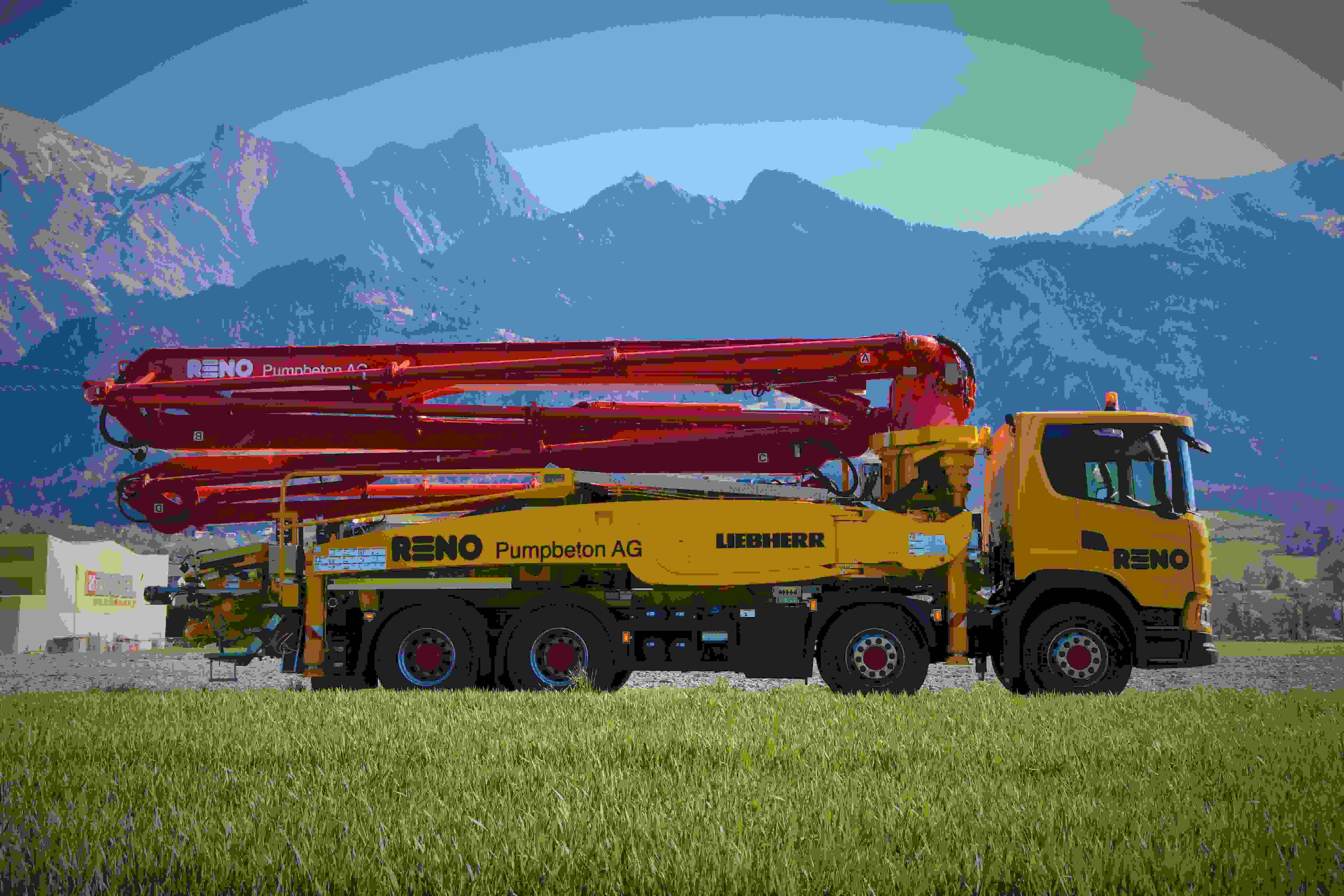 Die Unternehmung Reno Pumpbeton AG ist ein Dienstleistungsunternehmen von fünf verschiedenen Kies- und Betonwerken. Daran beteiligt sind die Calanda Gruppe AG, Kieswerk Oldis AG, Logbau AG, Foser Kies- und Beton AG und Kieswerk Untervaz AG. Zusammen teilen sie sich drei Autobetonpumpen mit Verteilmasten von 24m bis 46m. Davon sind zwei in Maienfeld stationiert und eine in Chur. Die Unternehmung Reno Pumpbeton AG wurde im Jahr 1980 gegründet und blickt heute auf rund 40 erfolgreiche Geschäftsjahre zurück. Am 2. April 2020 sollten die grossen Feierlichkeiten samt geladenen Gästen stattfinden. Durch die Massnahmen des Bundes gegen das Virus COVID-19 musste die 40-Jahre-Jubiläumsfeier kurzfristig abgesagt werden. Der Fahrzeugübergabe stand jedoch nichts im Weg und bei schönstem Wetter und bester Kulisse durften Scania Schweiz AG und Liebherr-Baumaschinen AG die gemeinsam ausgerüstete Autobetonpumpe in Maienfeld GR auf dem Areal der Logbau AG übergeben.