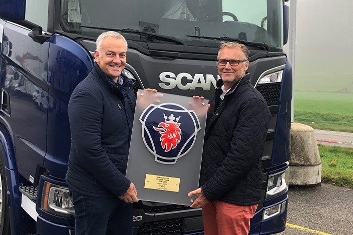 Gerhard Waser (à gauche), directeur général de Scania Schweiz AG, remet une plaque commémorative à Dominique Kolly à l'occasion de l'anniversaire de l'entreprise.