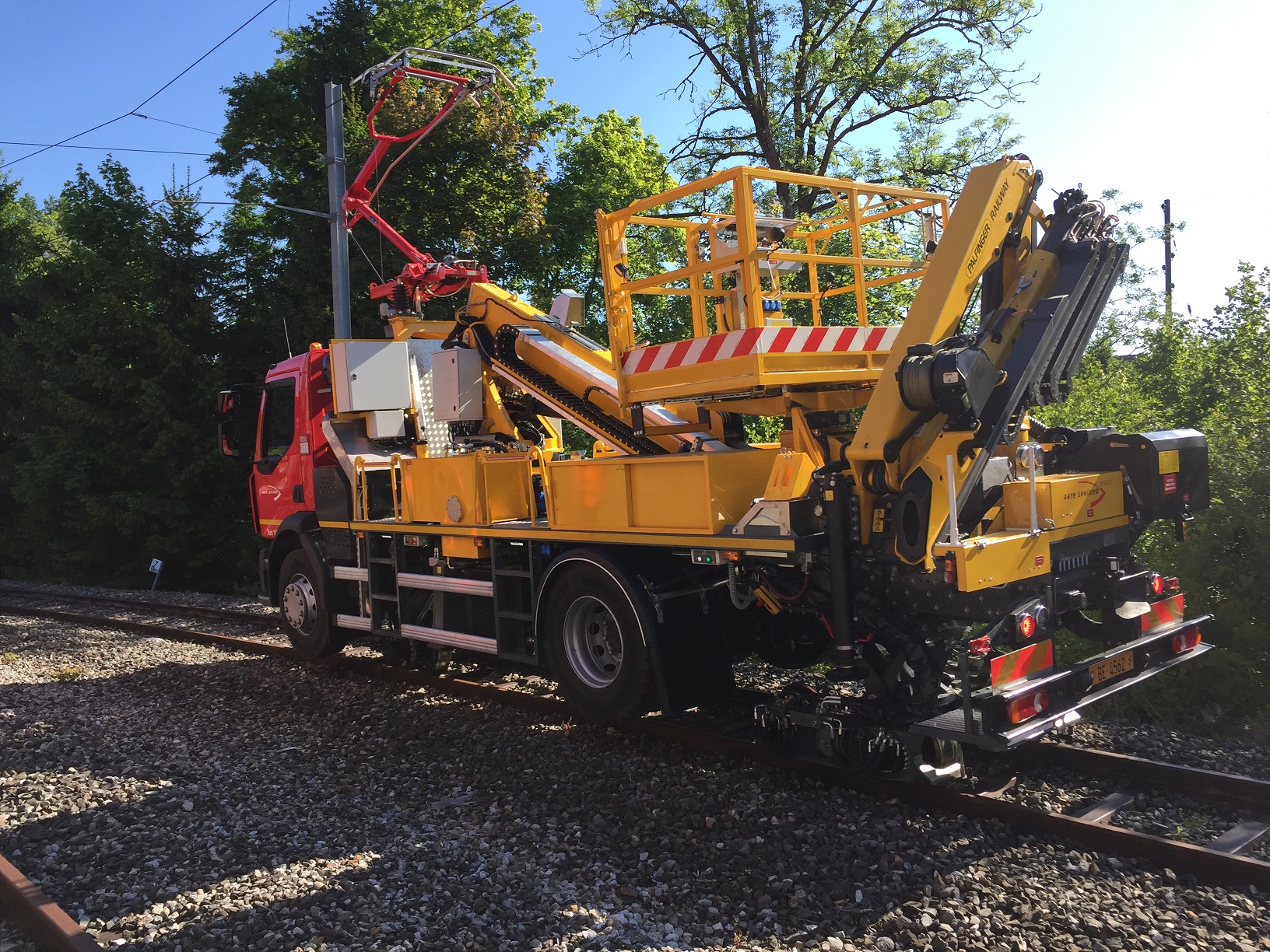 Lors du processus de sélection, le fabricant français Geismar S.A.S a rapidement retenu l'attention. L'offre globale paraissait séduisante et répondait parfaitement aux besoins spécifiques de la société Aare Seeland mobil SA. Le véhicule rail-route V2R840CGR avec plateforme élévatrice et grue a été présélectionné et a finalement remporté le marché. Le véhicule rail-route est construit sur le châssis d'un Renault Trucks D18 P4X2 250E6. Son moteur diesel de 7,7 litres de cylindrée à six cylindres en ligne développe 250 chevaux. Le couple maximal de 950 Nm est disponible entre 900 et 1700 t/min. La particularité, bien sûr, est que le Renault Trucks D18 est équipé d'un bogie ferroviaire à l'avant et à l'arrière qui peut être abaissé et relevé au moyen d'une commande hydraulique, le transformant de véhicule routier en véhicule ferroviaire. Les roues ferroviaires sont entraînées par un moteur hydraulique, qui assure également les opérations de freinage.