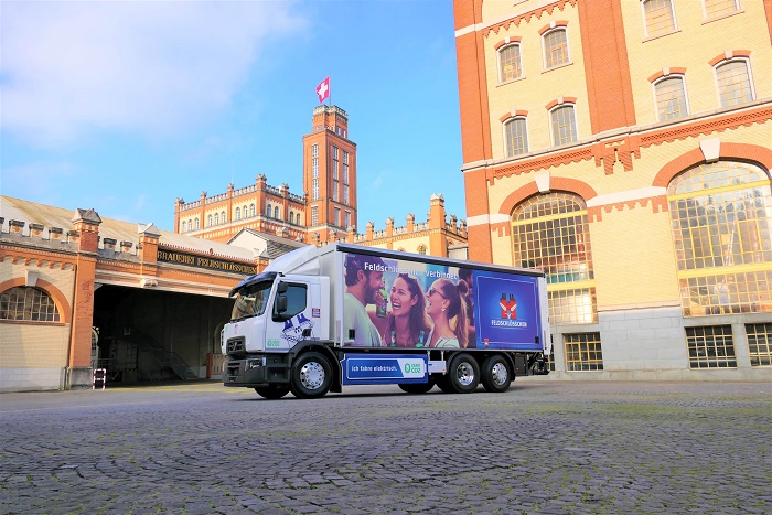 En effet, Feldschlösschen et le groupe Carlsberg ont pour ambition d’atteindre une distribution qui ne produise aucune émission de CO2. Le brasseur Feldschlösschen atteindra cet objectif notamment grâce à l’utilisation de ses camions électriques, chargés en électricité renouvelable, pour les derniers kilomètres, et du rail pour les longues distances.
