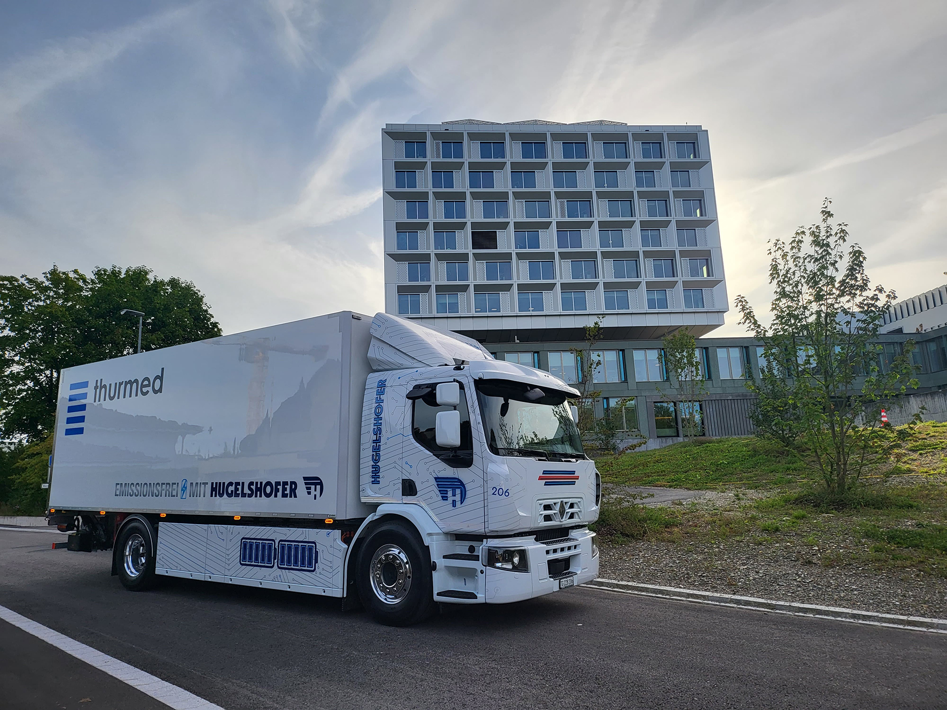 La société Hugelshofer Logistik AG à Frauenfeld vient d'insérer dans sa flotte un nouveau camion 100 % électrique. Il s'agit d'un Renault Trucks D Wide E-Tech P4x2, qui approvisionnera les hôpitaux du canton de Thurgovie.