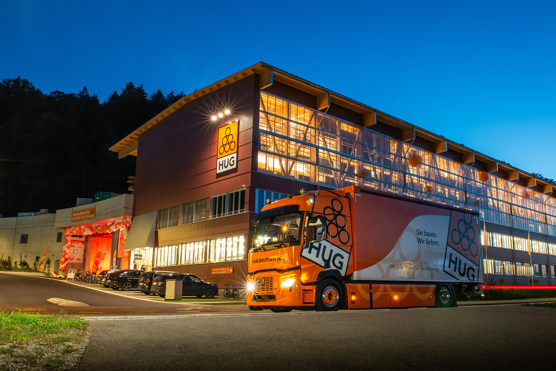 Implantée dans la région de Zurich ainsi que dans les cantons voisins d’Argovie et de Saint-Gall, Hug Baustoffe AG, dont le siège est à Nänikon, est une entreprise de référence dans son secteur. Malgré sa croissance, l'entreprise reste une affaire familiale, un atout qu'elle revendique avec fierté. Avec onze sites répartis dans la région zurichoise, le siège de Nänikon coordonne le commerce de matériaux et d'équipements de qualité dans divers domaines: salles de bains et sanitaires, construction, technique de fixation, équipements de protection et vêtements de travail, jardinage, céramique, ainsi que machines et outils. Pour assurer ses livraisons, l’entreprise dispose d’une flotte de onze camions lourds, dont six portent l'emblème Renault Trucks.