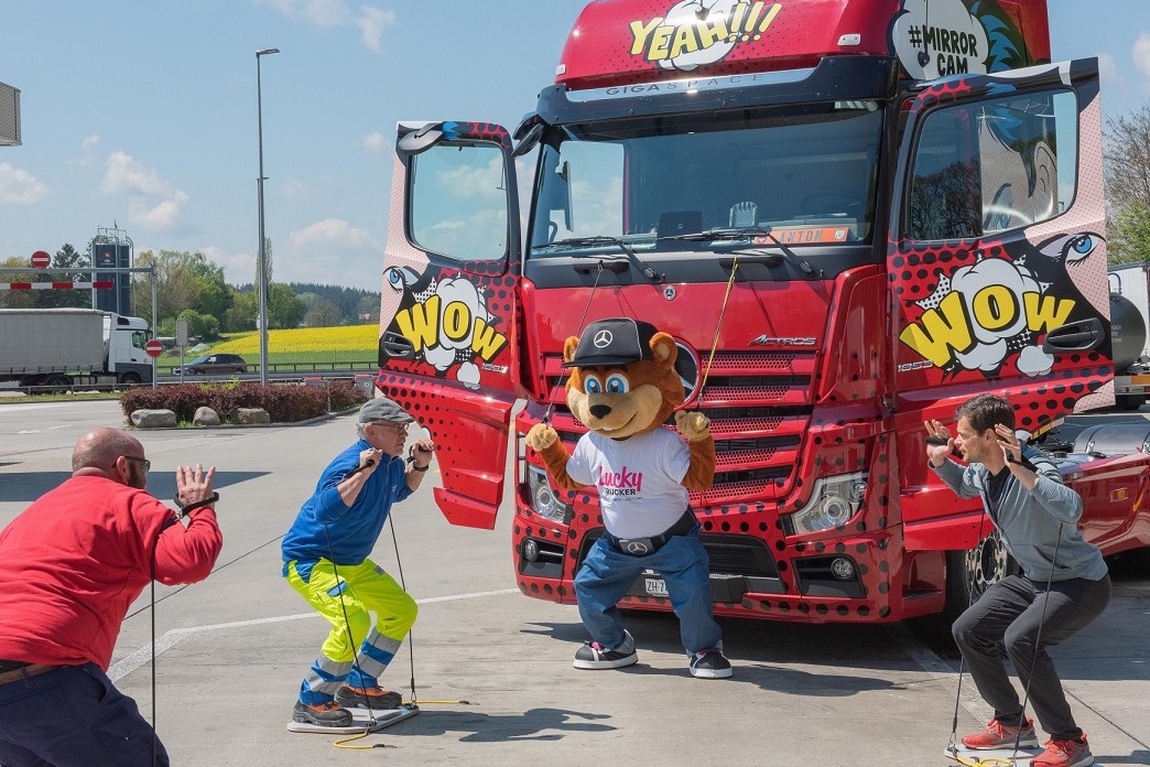 Quelle solution à cela ? « Le sport évidemment ! », affirme Patrick Küng, ancien champion du monde de ski alpin. Ce que la plupart des gens ignore, c’est que Patrick Küng possède lui-même un permis poids-lourd et qu’il effectue encore quelques trajets pour l’entreprise de transport de son père. « Je sais donc de quoi je parle », souligne-t-il. Avec la mascotte qui s’appelle Lucky, il se tient sur le parking de l’aire d’autoroute Gunzgen Nord. Les conducteurs de camion entrent vite en conversation avec Patrick Küng, car ils ne connaissent que trop bien les problèmes qu’il aborde.