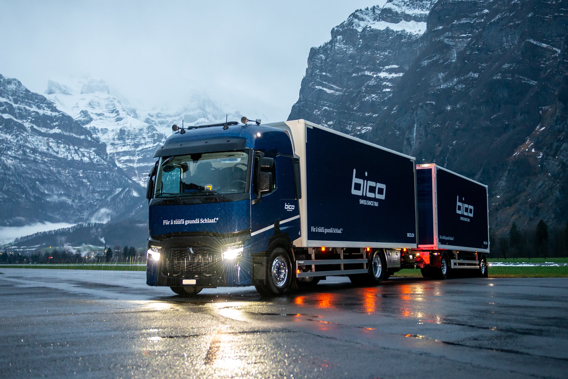 Un nouveau train routier, aux couleurs et aux inscriptions de l'entreprise, livre depuis peu les revendeurs de matelas Bico dans toute la Suisse. Le choix du véhicule tracteur s'est porté sur un Renault Trucks T430 P4x2 – pour la première fois, mais certainement pas la dernière.