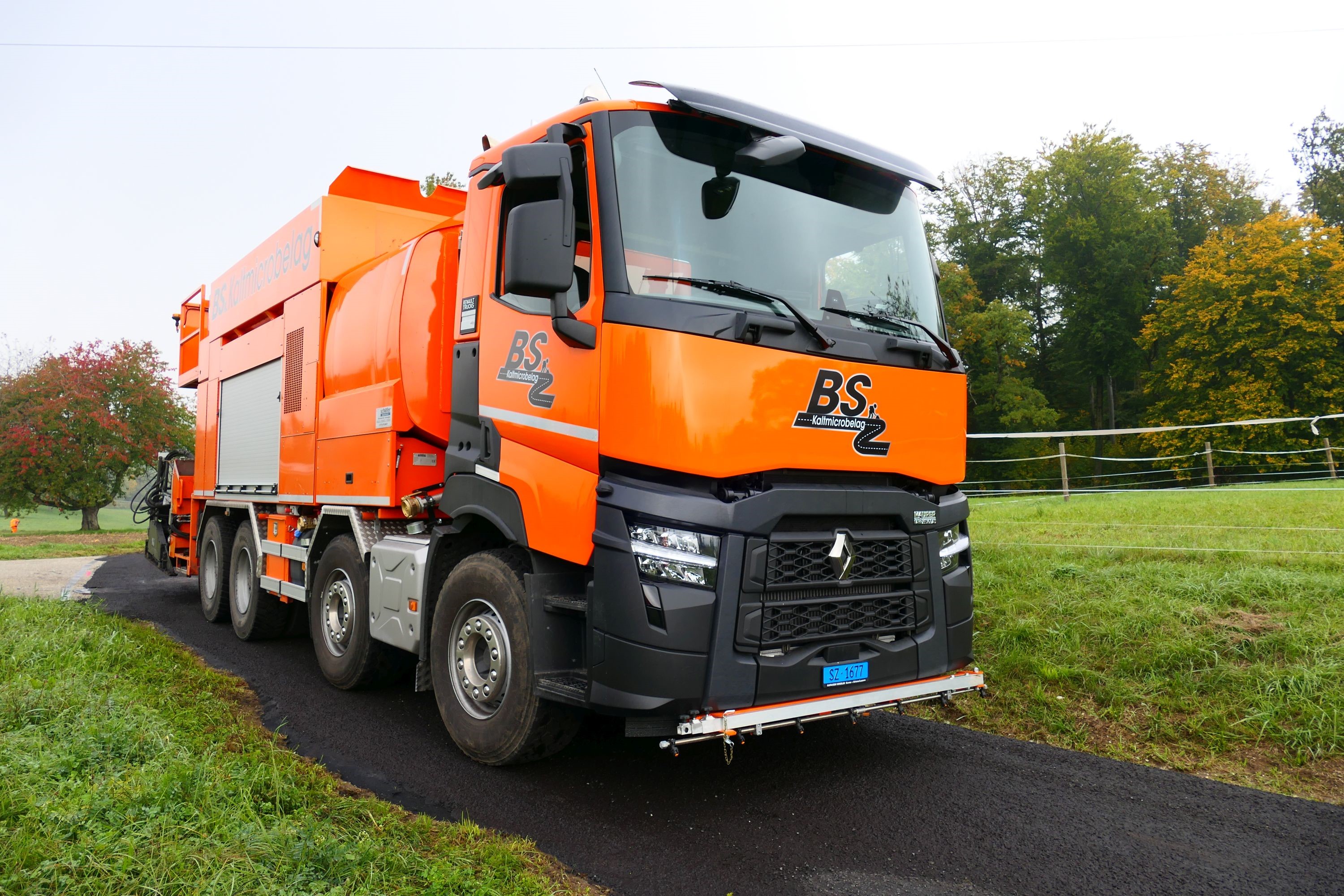 BS Kaltmicrobelag AG a complété son parc de véhicules existant avec un C480 P8x4 EVO de Renault Trucks. Une carrosserie très complexe permet à ce camion à quatre essieux d'appliquer des revêtements routiers en un temps record.