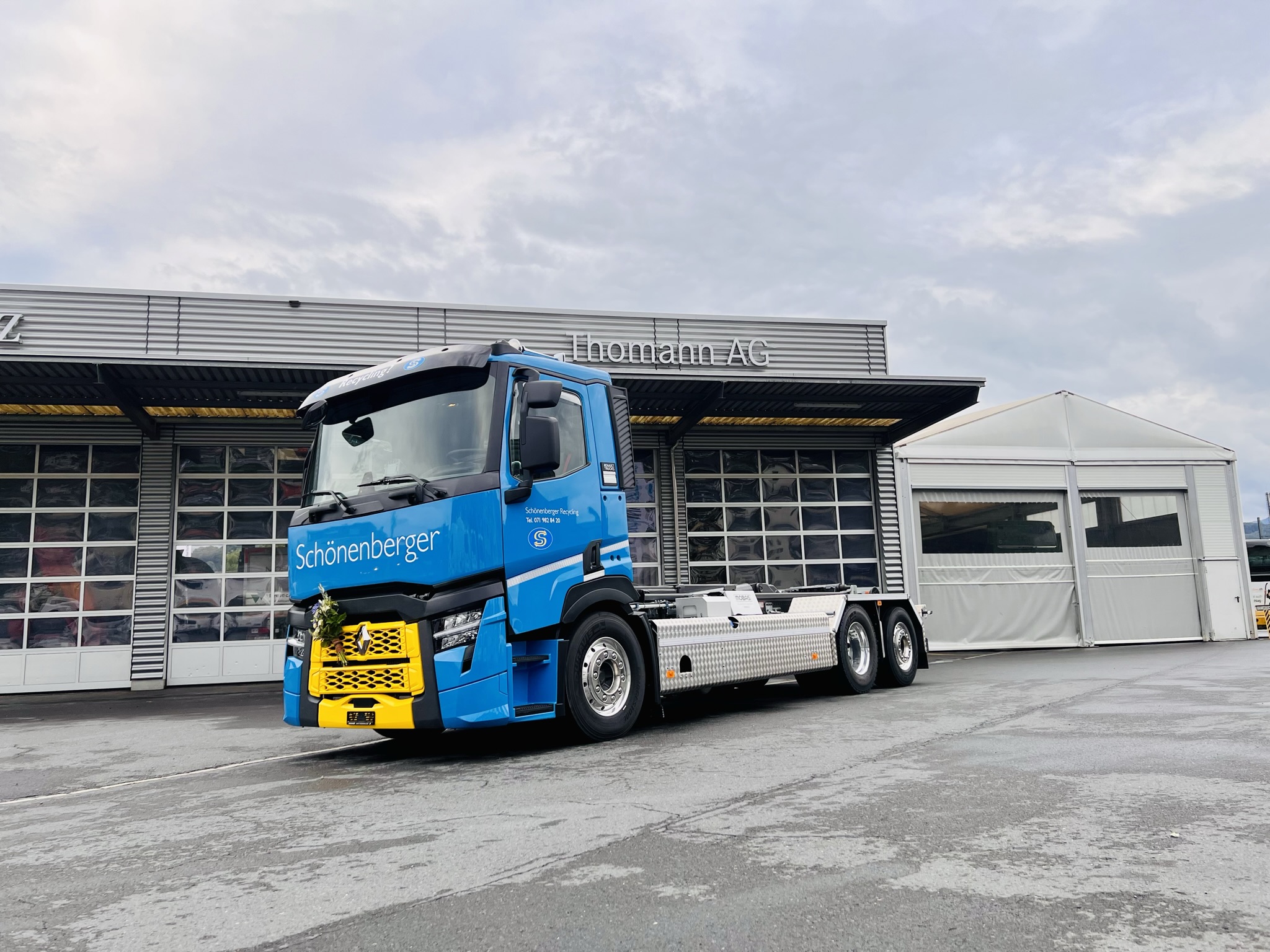 Michel Schönenberger explique en quelques mots comment l'entreprise Schönenberger Recycling Toggenburg AG a découvert la marque Renault Trucks : « En 2009, nous avons pris possession du premier Renault Trucks. Nous avons rapidement constaté que le constructeur français de véhicules utilitaires avait fait un saut quantique au cours des dernières années. Cela concerne la technique, l'équipement et la maniabilité. Mais le service d'excellence de Thomann Nutzfahrzeuge AG nous a également totalement convaincus ».