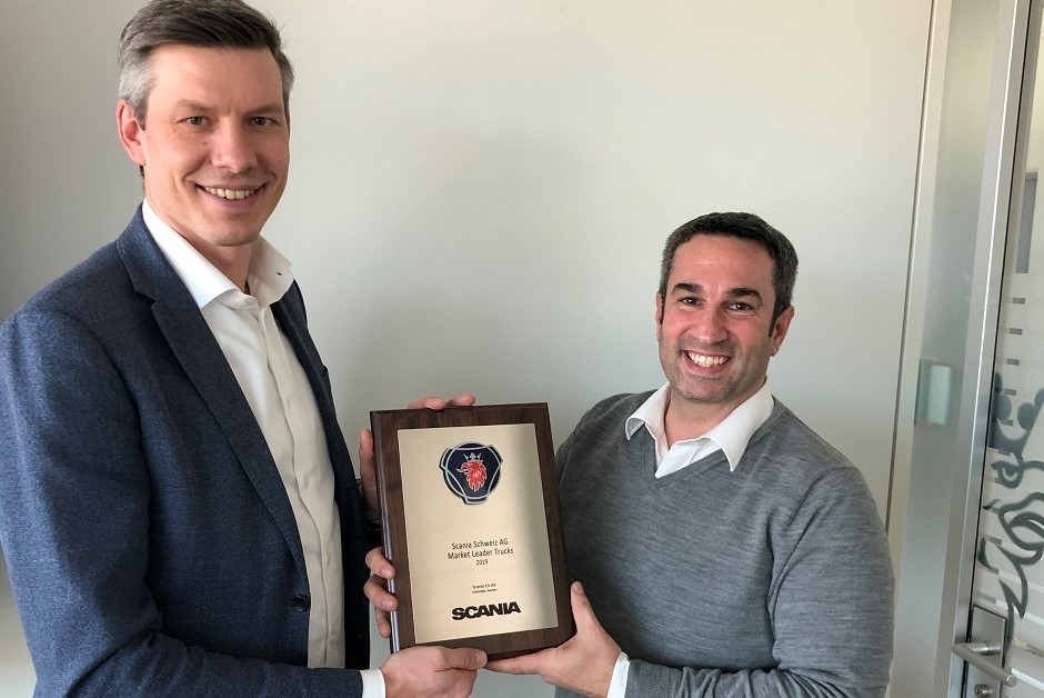 Niklas Pederson (directeur régional des ventes de camions Scania pour la Suisse, la France et le Benelux) a remis à Riccardo Virga (à droite), directeur des ventes de Scania Suisse, la deuxième plaque d'honneur en tant que leader du marché des camions 2019.