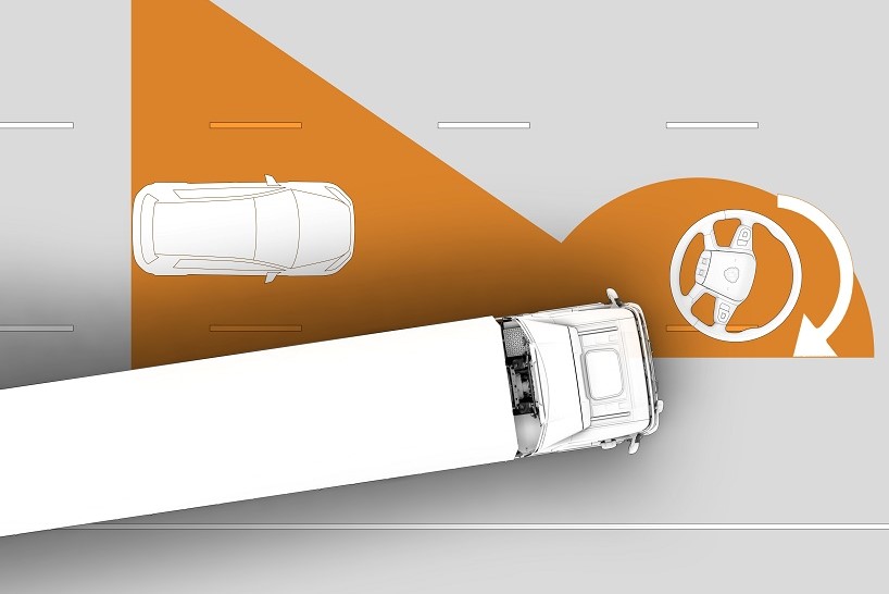 - LCP (Lane Change Collision Prevention) – prévention des collisions lors des changements de voie : Le système LCP collabore avec l’assistant d'angle mort de Scania pour éviter les incidents lors des changements de voie. Lorsque l’assistant d’angle mort déclenche son alerte la plus intense, lorsqu’il détecte par exemple un autre véhicule, le système LCP utilise la direction active pour arrêter le changement de voie (même si le clignotant est activé) et reconduit le camion sur sa voie d’origine.
