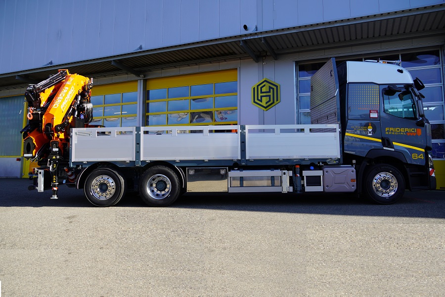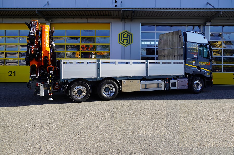 L'entreprise Friderici Spécial SA renouvelle actuellement sa flotte de poids lourds avec sept nouveaux Renault Trucks T520 et C520. Parmi les tracteurs destinés aux transports lourds et aux convois spéciaux, deux sont en silhouette 6x2 et trois en 6x4. Les tracteurs 6x2 sont homologués pour un poids total de 70 tonnes, les silhouettes 6x4 pour 110 tonnes. Les tracteurs sont complétés par deux porteurs 6x2 avec une grue Effer 395 - 5S. Ce modèle est équipé du système électronique Progress qui permet un contrôle total de la grue. Déployée à 18 mètres, la grue peut soulever un poids impressionnant de 2,1 tonnes. Avec l'extension Jib, elle atteint une portée de 28 mètres avec une capacité de charge maximale de 685 kg. La superstructure sophistiquée provient de Hodel Betriebe à Grosswangen.