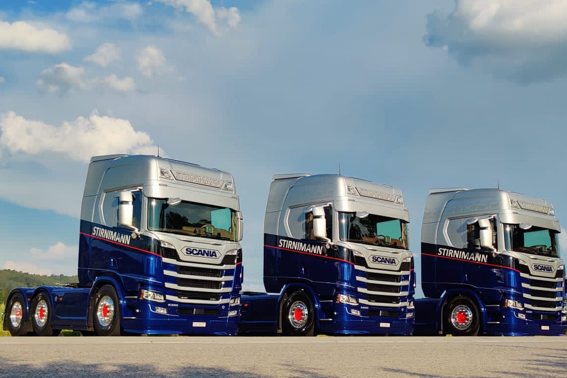 Lors de l'achat et de la mise en service des trois tracteurs de semi-remorque à suspension pneumatique, la société a décidé avec Calag à Langenthal de moderniser le design des camions et son identité visuelle. Autrefois peints en argent et décorés de trois bandes bleues différentes, les véhicules se présentent désormais dans les couleurs bleu et argent, interrompues par une bande noire, ce qui les rend beaucoup plus modernes et dynamiques, même de loin. Les moyeux de roues, déjà peints en rouge auparavant, complètent la nouvelle identité visuelle de Stirnimann Transport AG. Très discrètes, les silhouettes de vaches au-dessus des portes ne se remarquent qu'au au deuxième coup d'œil. Ces dessins de papier découpé se trouvent non seulement sur les véhicules, mais dans toute la présentation de l'entreprise, dans la correspondance et partout où figure le nom de Stirnimann Transport AG, marquant ainsi la nouvelle image toute en reflétant l'origine de l'entreprise et son activité principale.