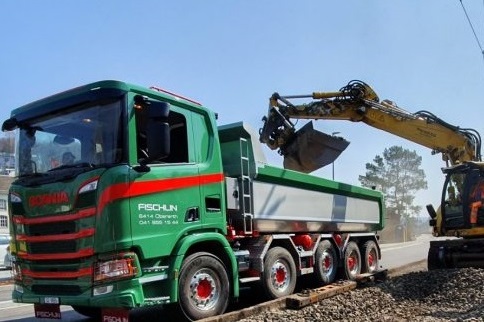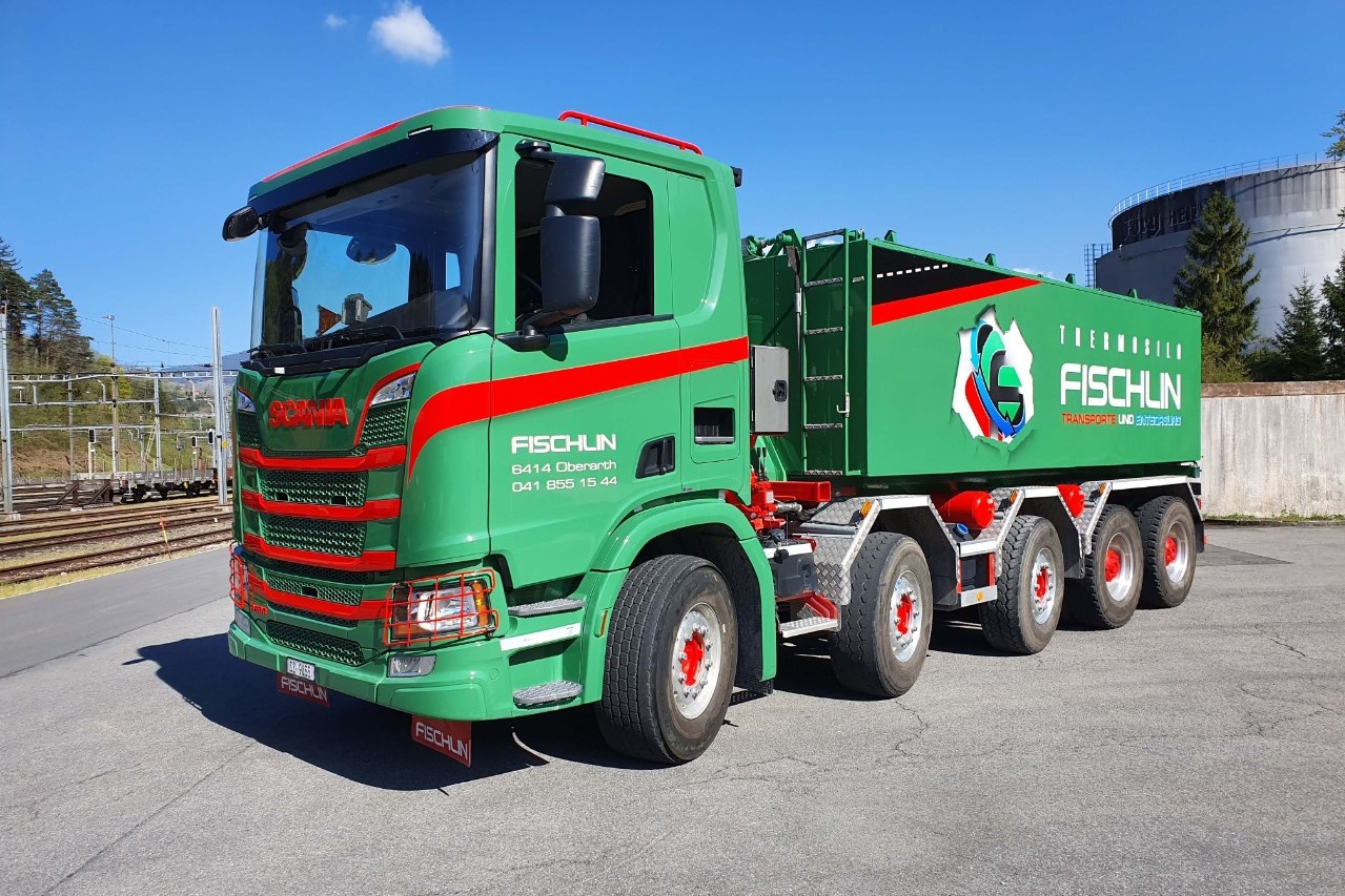 Fischlin Transport GmbH à Oberarth exploite encore d’autres véhicules Scania: un Scania 112 avec benne basculante sur trois côtés fabriqué en 1986, deux bennes arrière R490 B 10X4/6 pour le transport de pierres et un Scania P410 B 6x2/4 multibenne de la dernière génération de véhicules pour le service de bennes dans les cantons de Schwyz et Zoug. Les deux derniers modèles Scania sont deux R500 B 10x4/6 identiques, dont les superstructures peuvent être échangées pour livrer les clients avec un camion malaxeur, une benne basculante ou un silo thermique, selon les besoins.